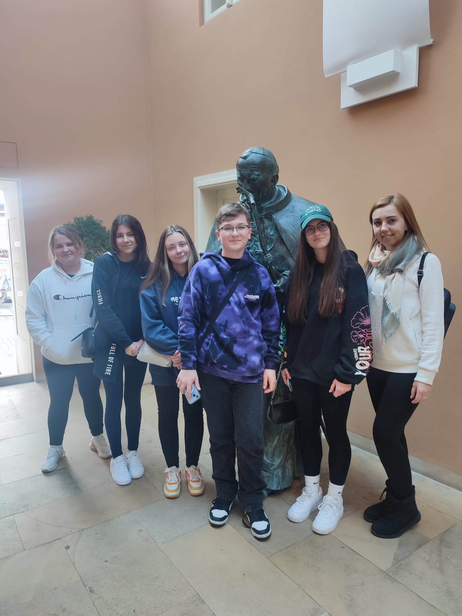 ... úprimné slová žiačky hovoria za mnohých ôsmakov a deviatakov, ktorí sa včera vrátili z exkurzie Krakov – Osvienčim – Vielička, ktorú absolvovali v dňoch 3. - 5. apríla 2023. Začínali sme prehliadkou Múzea rodného domu pápeža Jána Pavla II. V byte rodiny Wojtylových vo Wadoviciach sú zhromaždené exponáty dávneho vybavenia, mnoho pamiatok spojených so životom a činnosťou pápeža: rodinné fotografie, kópie Karolových vysvedčení, dokumenty z etáp jeho života a dokonca aj lyže, vak a kajakové veslo ako dôkaz jeho turistických záľub.