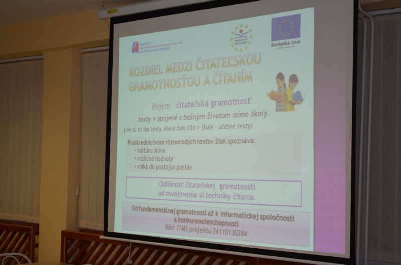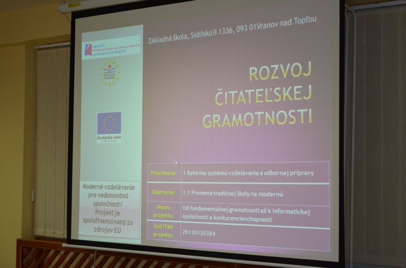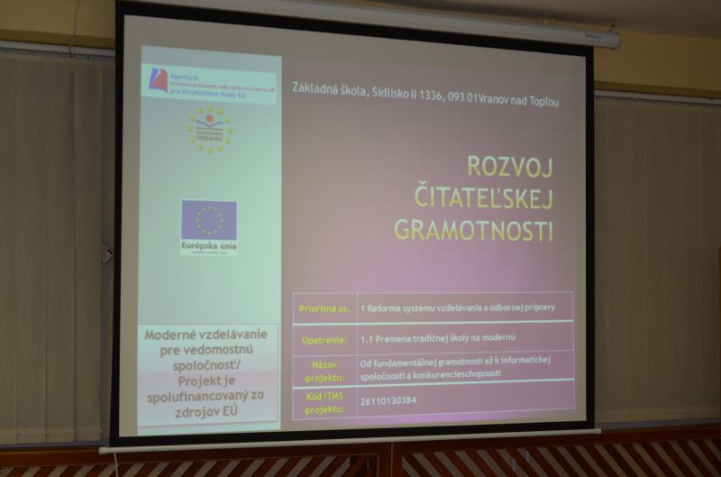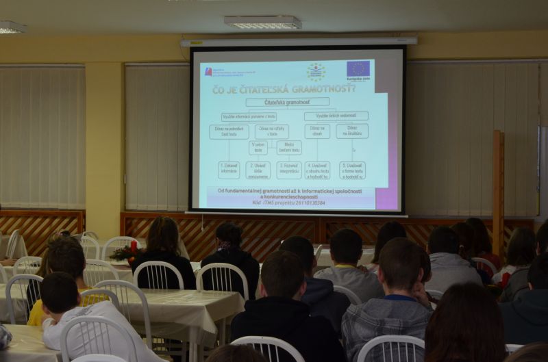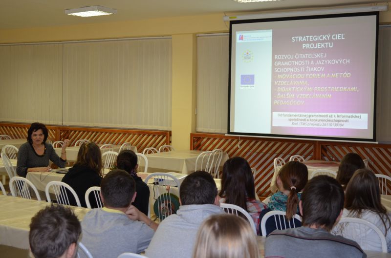 Mgr. Helena Kajlová predstavila druhákom a deviatakom členov projektového tímu a základné ciele projektu. V dvoch prezentáciách pripravených manažérom publicity Mgr. Petrom Kocákom vyzdvihla dôležitú úlohu projektu rozvíjať čitateľskú gramotnosť a jazykové schopností žiakov využívaním nových foriem a metód vo vyučovacom procese a ďalším vzdelávaním pedagógov. Zároveň, tak ako predošlý projekt E-learning – škola budúcnosti, aj tento, má pomôcť vybaviť kabinety a triedy modernými didaktickými pomôckami a prostriedkami. V pláne je aj zriadenie modernej jazykovej učebne a umožnenie trom pedagógom – učiteľom anglického jazyka - zúčastniť sa na študijnom pobyte v anglicky hovoriacej krajine.